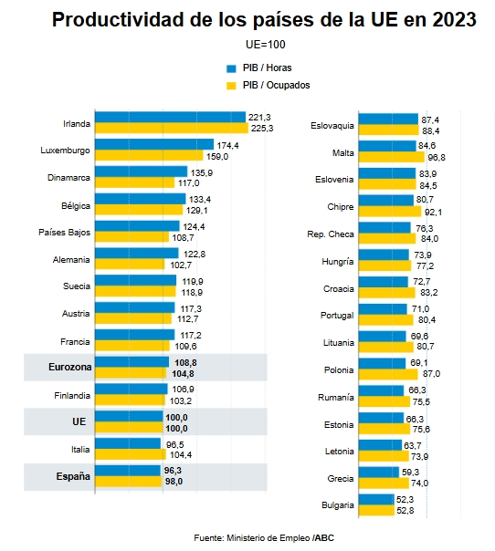 Si tomamos como punto de partida 2013, desde ese año hasta 2023, la productividad por ocupado en nuestro país despuntó solo un 0,7% frente a la media comunitaria del 5,9%, según un reciente informe del Instituto de Estudios Económicos a partir de información de Eurostat, que subraya que el avance nacional es tan limitado que «implica un cierto estancamiento de este componente que justifica que el mismo deba ser objeto de atención dentro de nuestra política económica». El documento revela, además, que de 2018 a 2023 la variable se desplomó en España un 1,9% mientras que en dicho periodo se incrementó un 1,3% en el Viejo Continente. Una brecha, ya cronificada, que responde a una combinación de elementos y ante la que los expertos piden medidas orientadas a la economía del conocimiento, al refuerzo del desarrollo tecnológico y a la creación de un entorno favorable a la inversión.